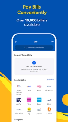 Settle your bills — postpaid, utilities, broadband, entertainment, loans, and local council, all from your eWallet. If you are low on credits, you can also reload your prepaid.